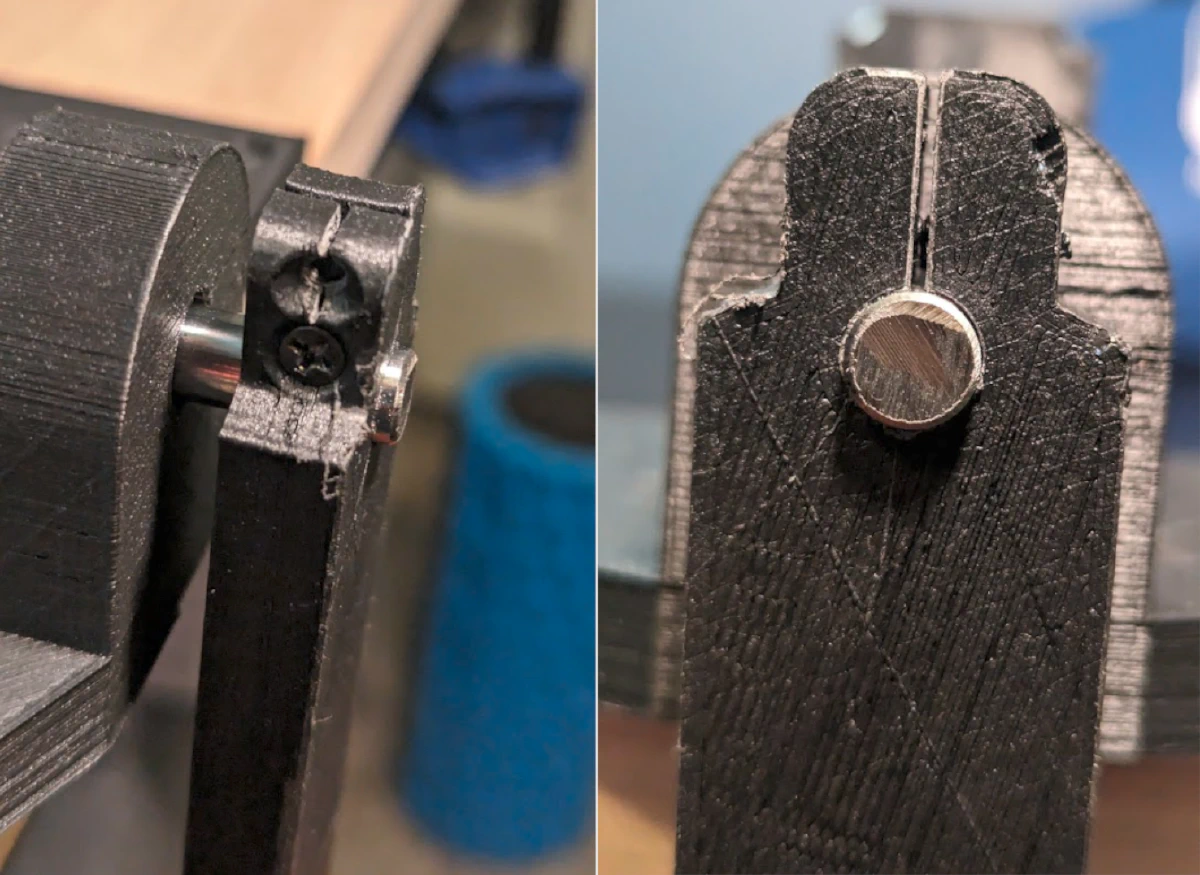 The pendulum arm is held on using only friction. Since it is plastic on metal contact, the arm does not have a very good grip. It isn’t bad enough to warrant fixing immediately unless there are issues later on. I tried tightening the screws for better grip. 1 screw tightened did help. 2 screws caused it to snap. It is still working for now. I should consider mounting a flange instead. Or alternatively, I can make the adjustable hole more compliant. In the same way I have a space between the two sides of the hole, I can extend the space further downwards. This fix is inspired from how the two piece shaft collar works.