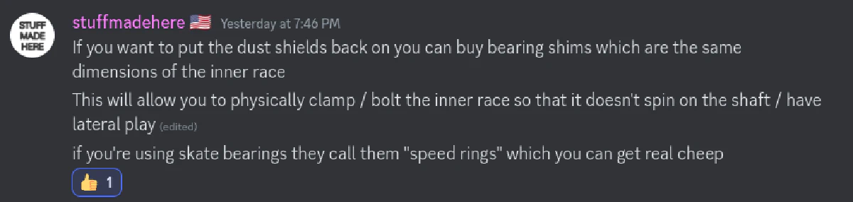 You might notice that the parts along the axle are not shaft collars but flanges. This was my hack to temporarily address several friction issues as I wait for new parts. One cause of unnecessary friction was from the shaft collars sitting flush against the bearing and the base.